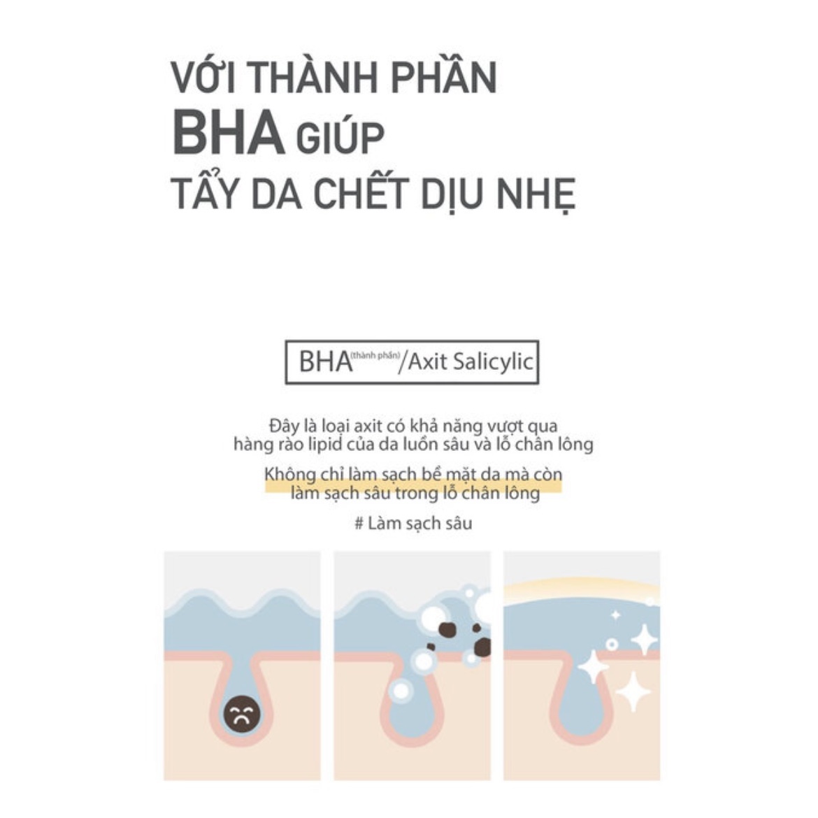 - BHA / Salicylic Acid: là một thành phần tan trong chất béo, có khả năng thẩm thấu qua da tốt nên nhanh chóng làm sạch bề mặt da, loại bỏ các tạp chất trong lỗ chân lông và se khít lỗ chân lông một cách hiệu quả