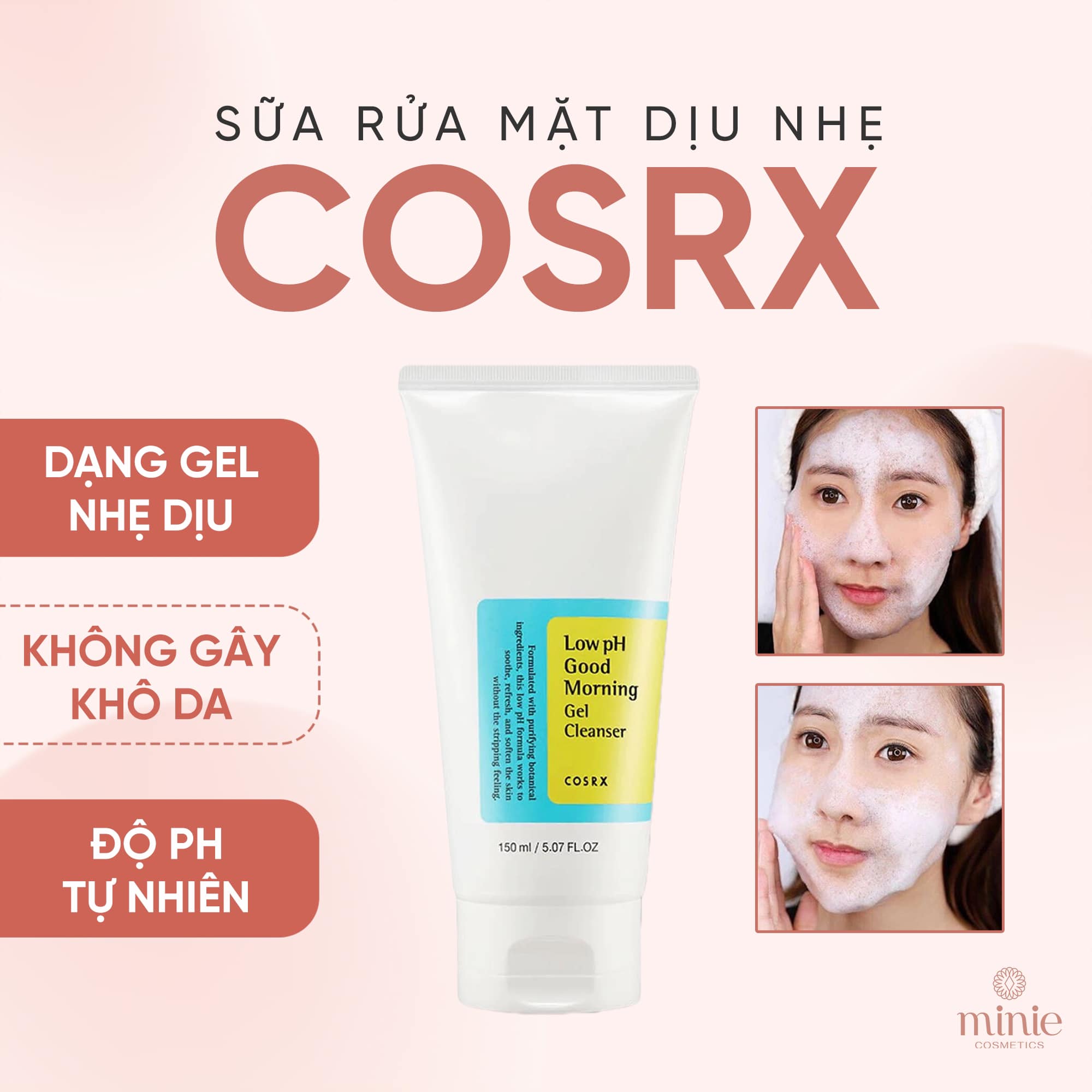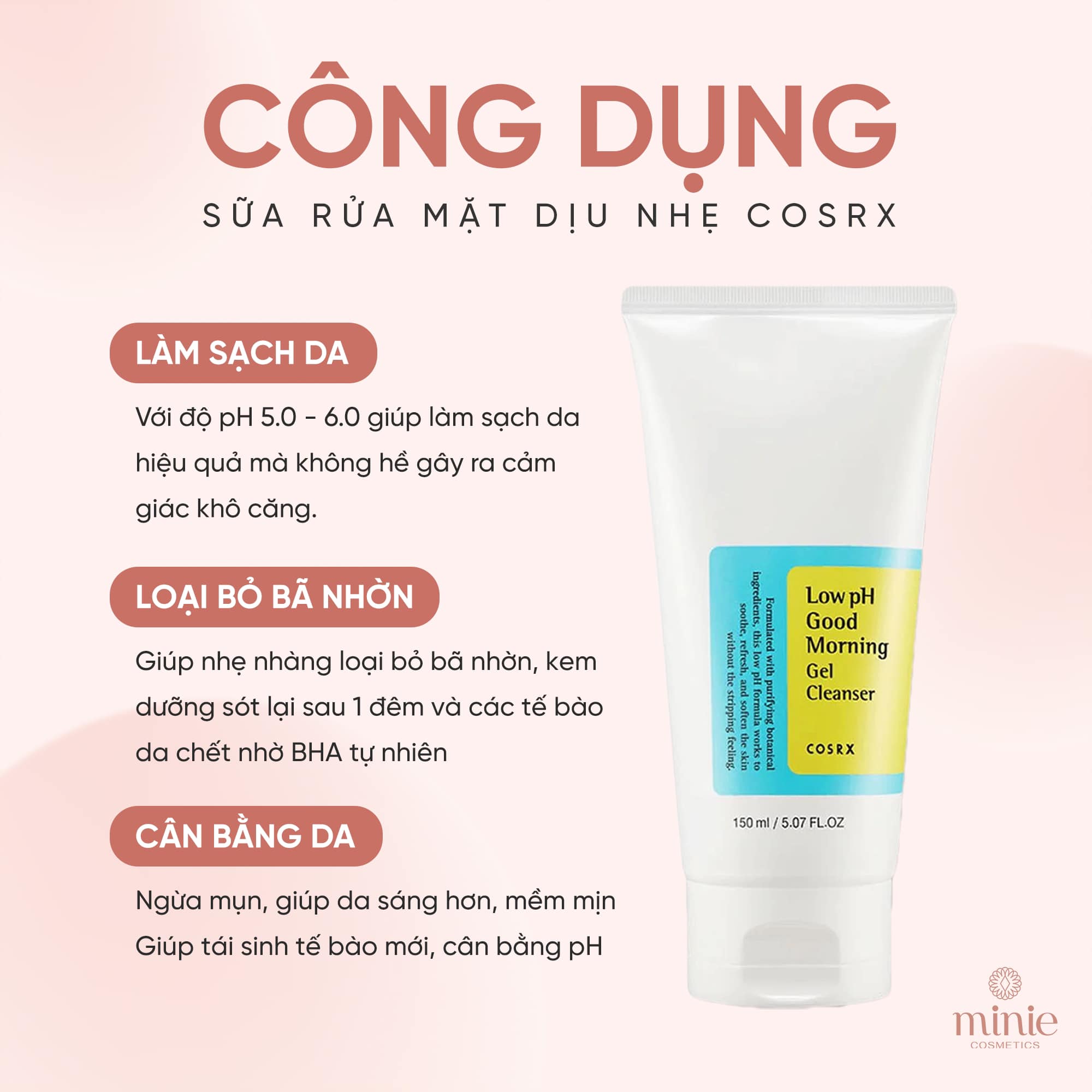 - Sữa Rửa Mặt Dạng Gel Dịu Nhẹ Cosrx Low pH Good Morning Gel Cleanser với thành phần chiết xuất từ thiên nhiên, giúp làm sạch mọi bụi bẩn, lớp trang điểm, dầu nhờn trên da.