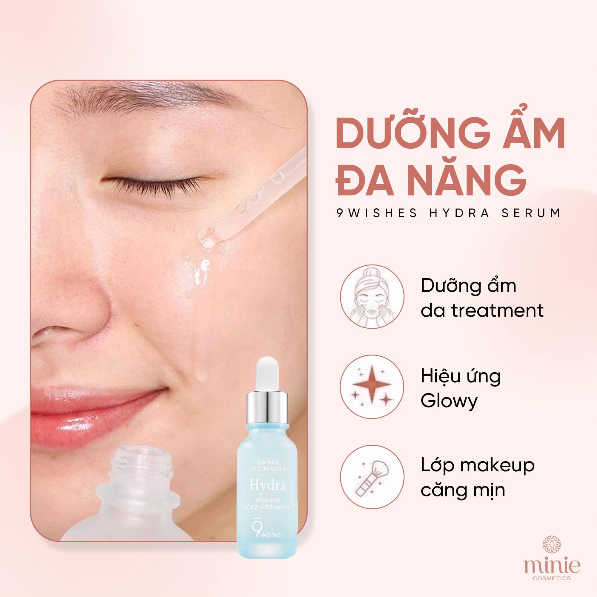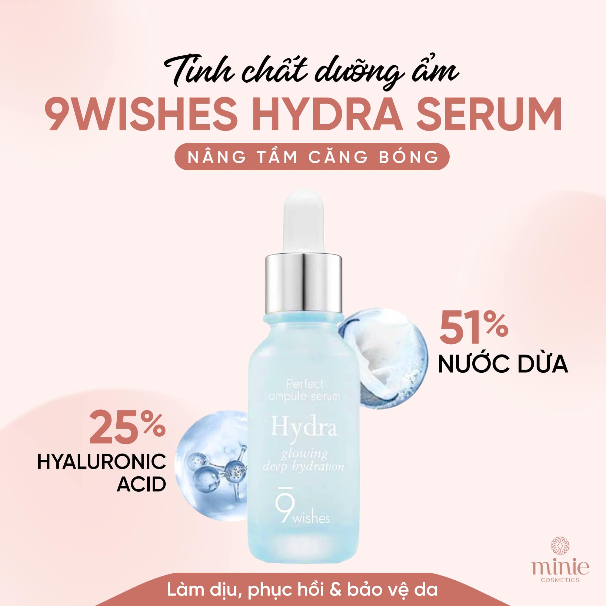 - Tinh Chất Dưỡng Ẩm, Cấp Nước, Căng Bóng Da 9 Wishes Hydra Glowing Deep Hydration Ampule Serum chứa nước dừa thay cho nước thông thường chứa nhiều vi lượng khoáng chất giúp cấp ẩm, nước nước nhanh chóng cho da, giảm thiểu tình trạng kích ứng