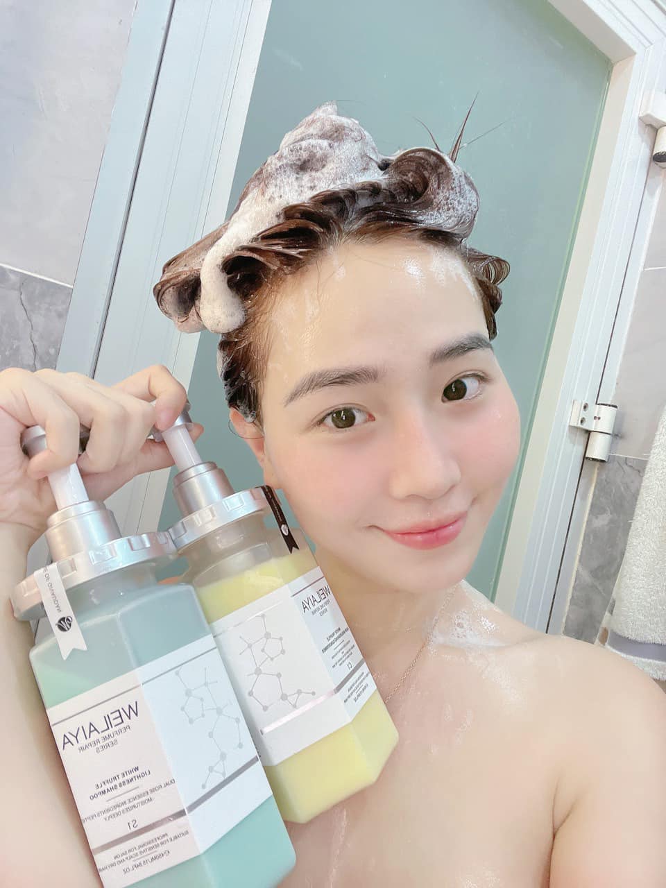 - Làm ướt tóc, lấy một lượng dầu gội vừa đủ và tạo bọt trong lòng bàn tay, nhẹ nhàng xoa lên tóc và da đầu