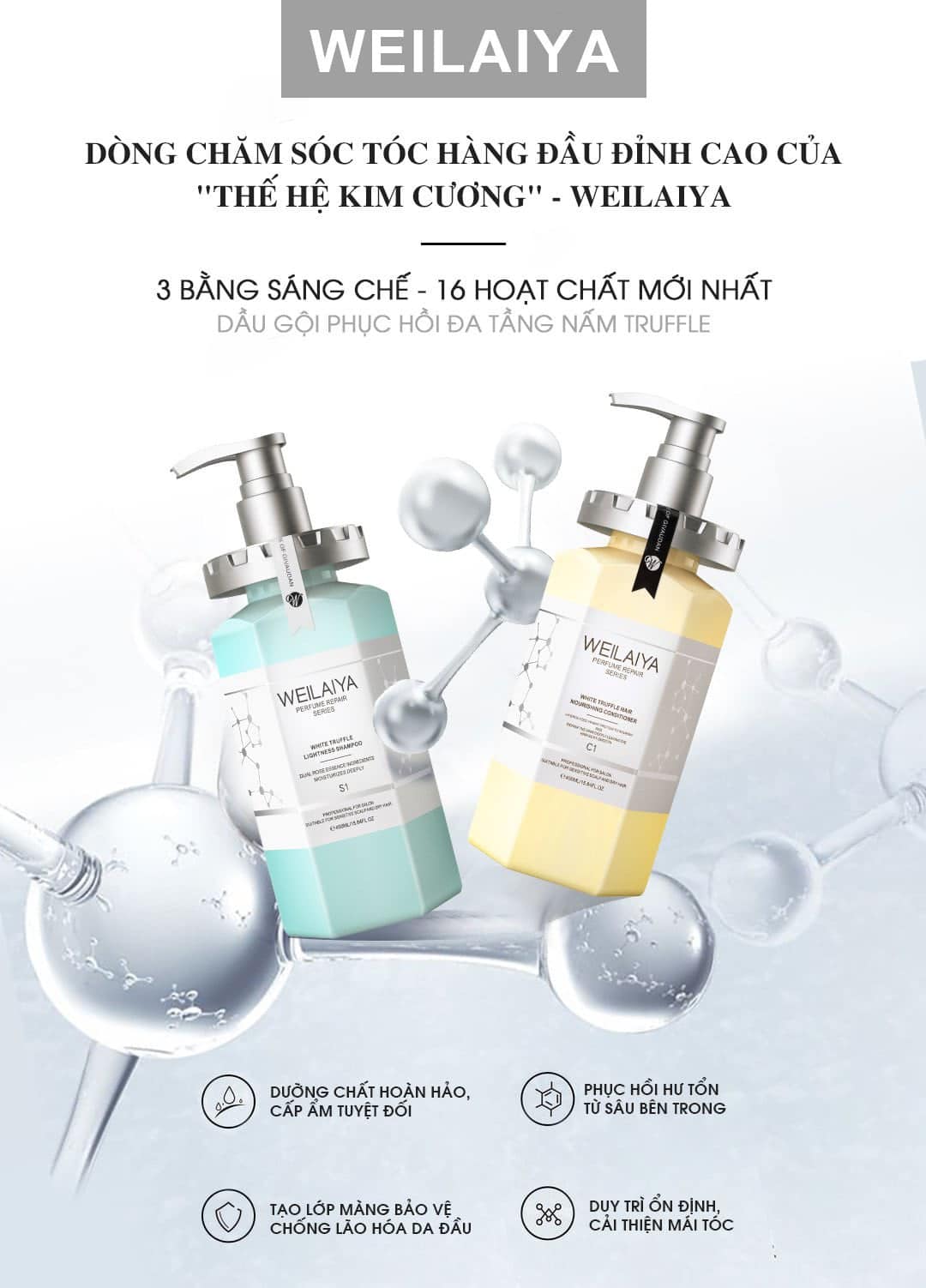Dầu gội phục hồi đa tầng Weilaiya chứa chiết xuất Nấm Truffle Trắng – một loại siêu thực phẩm giàu dinh dưỡng và quý hiếm trên thế giới, kết hợp với hơn 17 loại Axit Amin tự nhiên, 65 loại Vitamin và khoáng chất, giúp bổ sung độ ẩm cho tóc, phục hồi chân tóc bị tổn thương, cải thiện xơ rối, kích thích mọc tóc, chăm sóc tóc từ gốc đến ngọn, mang lại hiệu quả toàn diện cho mái tóc và da đầu.