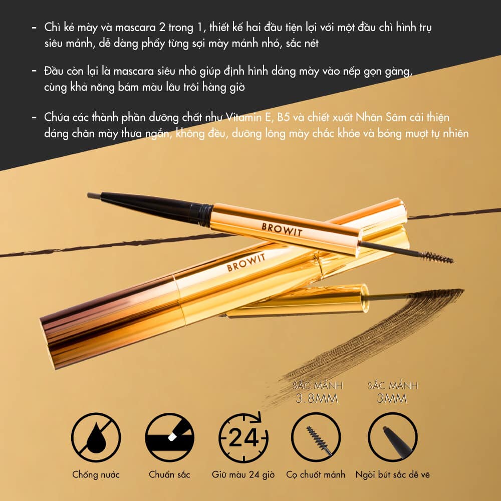 Chì Kẻ Mày Và Mascara Mày 2 Trong 1 Browit Ultra Fine Duo Eyebrow Pencil & Mascara là sản phẩm trang điểm lông mày 2 đầu của thương hiệu Browit với một đầu là chì kẻ mày, một đầu là mascara cho lông mày giúp tạo màu và tạo đường nét cho lông mày, giúp làm đẹp lông mày.