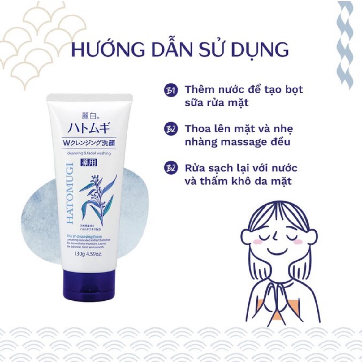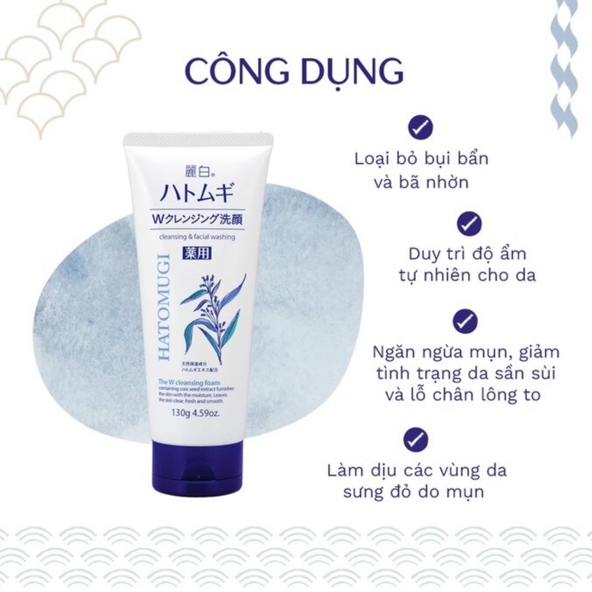- Sữa Rửa Mặt Tẩy Trang & Làm Sáng Da Nhật Bản Hatomugi Cleansing & Facial Washing 130g với thành phần cốt yếu là chiết xuất ý dĩ có tác dụng chống viêm, kháng khuẩn, giúp da mịn màng, khôi phục độ săn chắc, se lỗ chân lông, hỗ trợ điều trị mụn, giảm thiểu sự xuất hiện các đốm nâu, làm đều màu da, giữ ẩm và ngăn ngừa các tình trạng khô ráp, bong tróc nhờ chứa nhiều loại Acid béo như Linoleic acid, palmitic acid, stearic acid và các vitamin như B1, B12 và E, protein và các hoạt chất steroid tự nhiên.