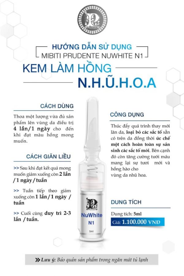 Kem làm hồng nhũ hoa NuWhite N1 Mibiti Prudente Professional được chiết xuất từ những thành phần như: Retinol, vitamin C, vitamin E, Provitamin B5, Acid kojic, chiết xuất lô hội, Cúc la mã, Deoxy-arbutin, Niacinamid, N-acetyl boldin, Rễ cam thảo, chiết xuất thục địa và chiết xuất lá cây tùng lam…