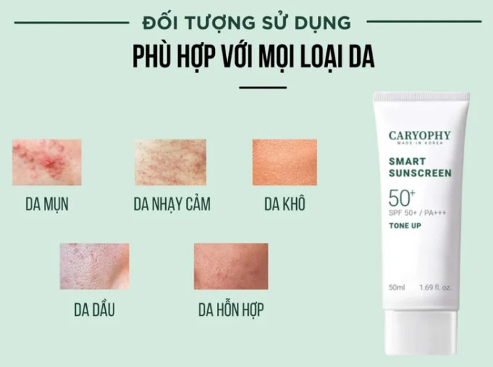 - Kem Chống Nắng Thông Minh Đa Chức Năng Caryophy Smart Sunscreen Tone Up SPF50+/Pa+++ là sản phẩm thông minh thế hệ mới có khả năng bảo vệ da hơn 98% trước tia UV và được tích hợp những công dụng vượt trội, bảo vệ da hoàn hảo trước tác hại của ánh nắng mặt trời, phản xạ lại tia UV ngăn không cho chúng tổn hại đến da, ngăn ngừa tình trạng lão hóa da, chống oxy hóa hiệu quả, tái tạo và phục hồi làn da bị tổn thương, ngoài ra còn hỗ trợ nâng tone da tự nhiên giúp da trắng sáng rạng ngời.
