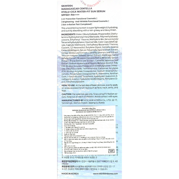 - Nước, Butylene Glycol, Titanium Dioxide, Zinc Oxide, Cyclopentasiloxane, Caprylyl Methicone, Niacinamide, Silica, Dimethicone/Vinyl Dimethicone Crosspolymer, Polyglyceryl-6 Polyricinoleate, Diethylhexyl Carbonate, Magnesium Sulfate, Aluminum Hydroxide, Stearic Acid, Centella Asiatica Extract, Madecassoside, Adenosine, Ethylhexylglycerin, Fragrance.