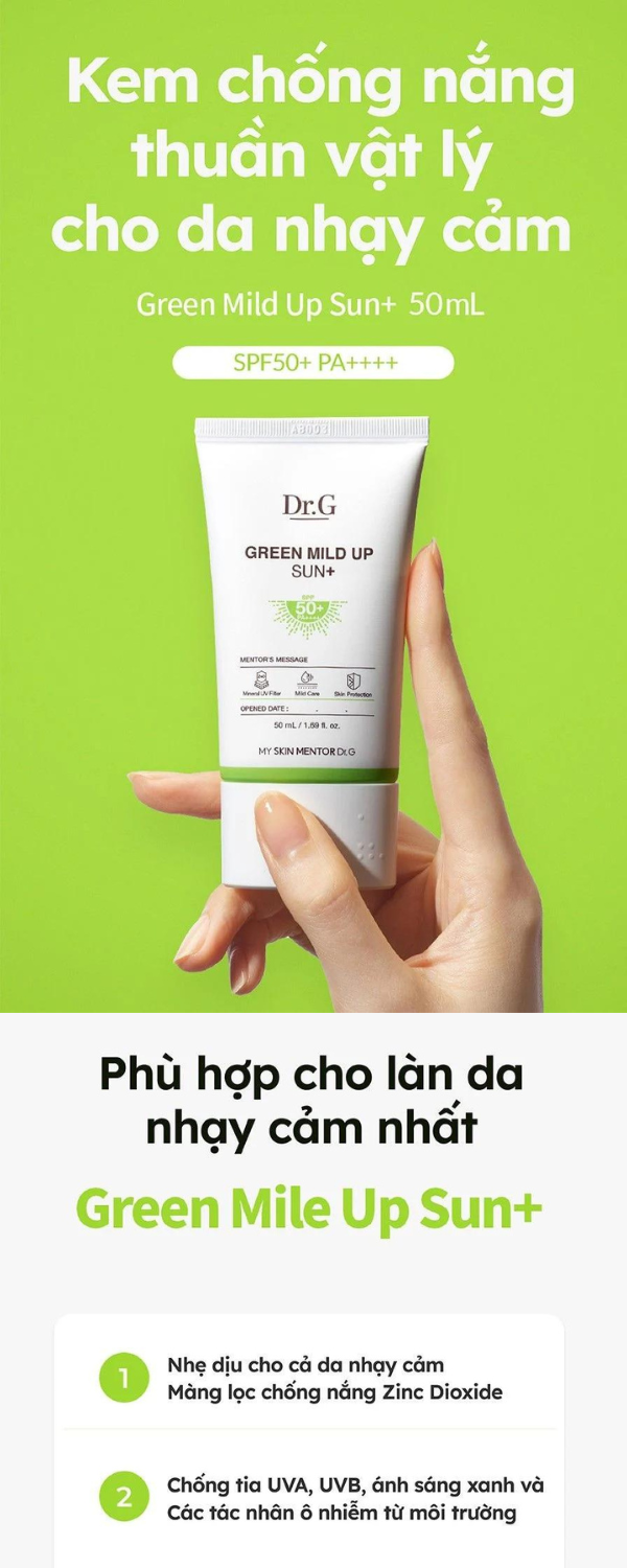 2. Kem Chống Nắng Thuần Vật Lý Dành Cho Da Nhạy Cảm Dr.G Green Mild Up Sun+ SPF 50+ PA++++ 50ml