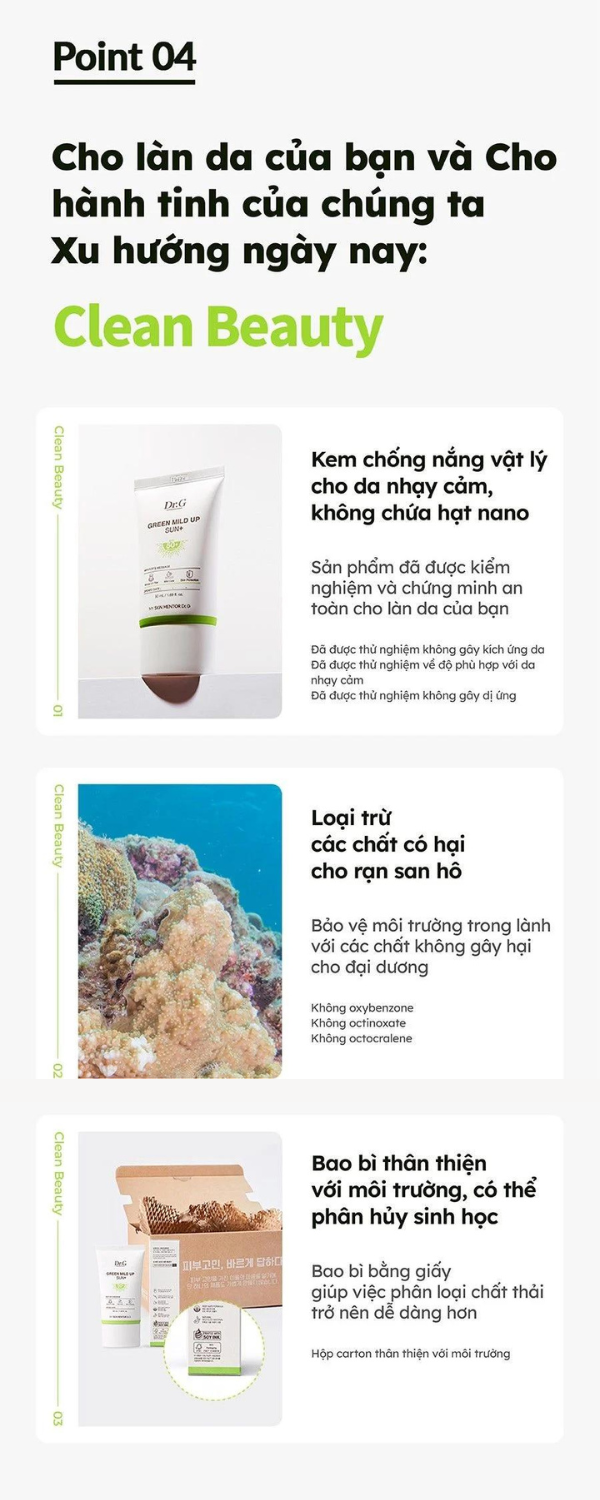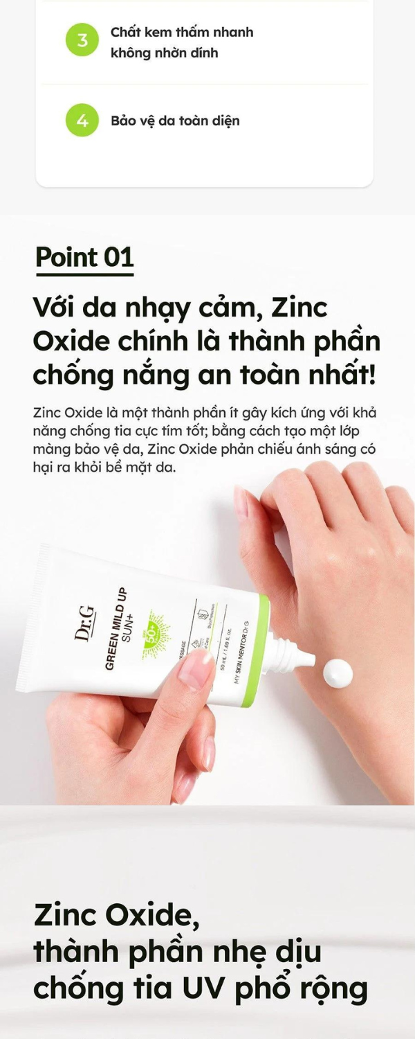 Là kem chống nắng khoáng chất cao cấp, được thiết kế đặc biệt cho làn da nhạy cảm. Sản phẩm không chỉ bảo vệ da khỏi tác hại của tia UV mà còn cung cấp dưỡng chất giúp da luôn mềm mại và khỏe mạnh. Với công thức đặc biệt chứa Zinc Oxide, kem chống nắng Dr.G Green Mild Up Sun+ đảm bảo sự an toàn và hiệu quả tối ưu cho mọi loại da, đặc biệt là da nhạy cảm.