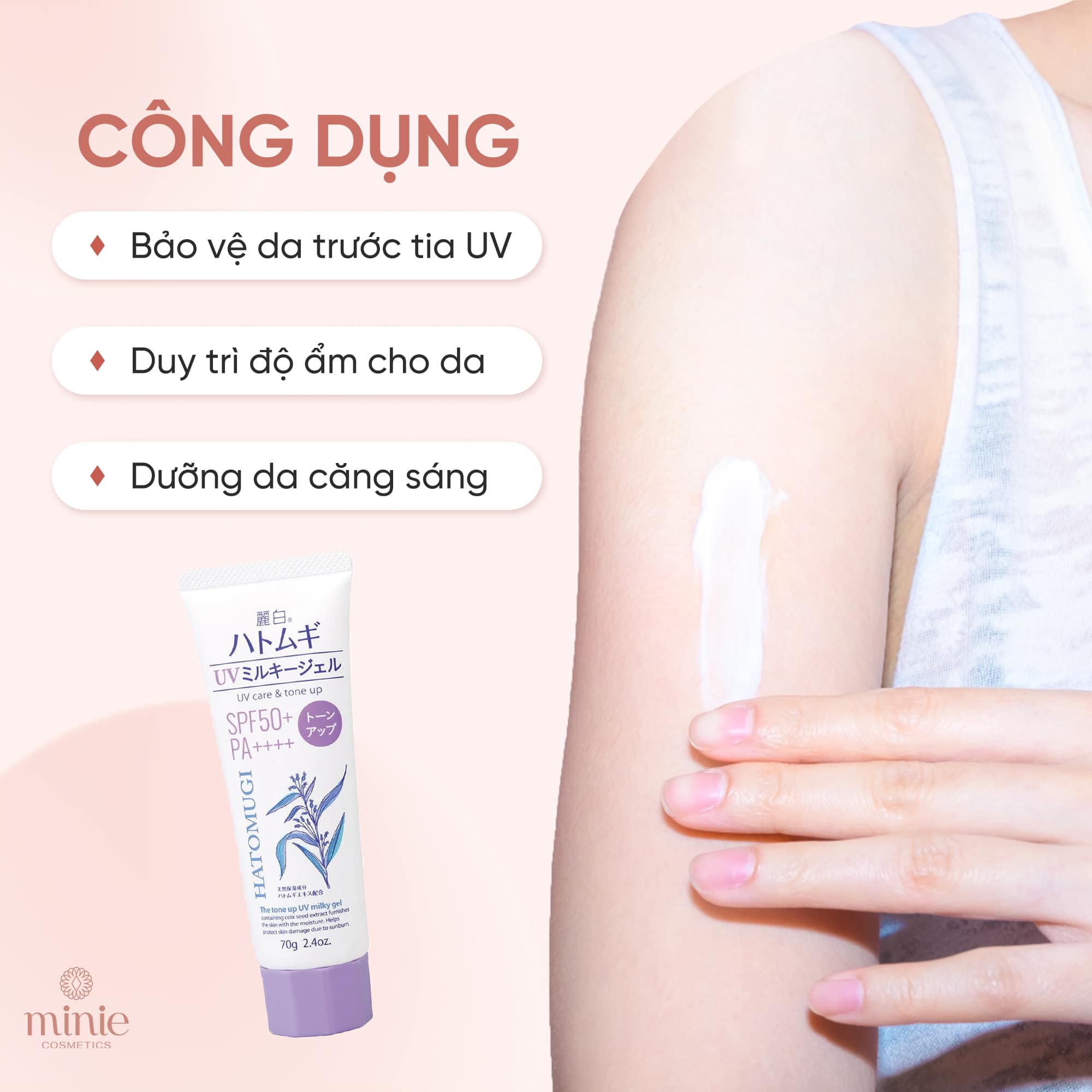 - Kem Chống Nắng Nâng Tone Dưỡng Ẩm, Làm Sáng Da Hatomugi The Tone Up UV Milky Gel SPF50+ PA++++ với công thức tối ưu bảo vệ da khỏi tia UV và các tác nhân gây lão hóa, sạm da.