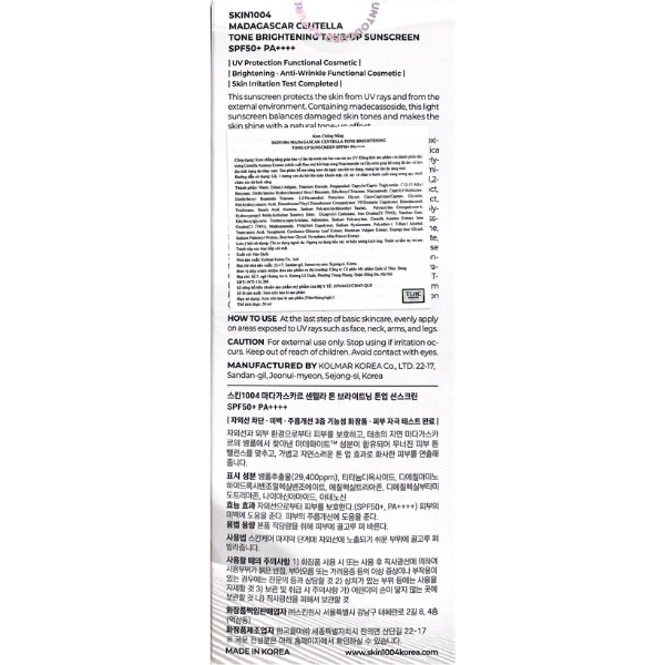 - Nước, Dibutyl Adipate, Propanediol, Diethylamino Hydroxybenzoyl Hexyl Benzoate, Polyglyceryl-3 Polydimethylsiloxyethyl Dimethicone, Ethylhexyl Triazone, Niacinamide, Methyl Methacrylate Crosspolymer, Triethoxycaprylylsilane, 1,2-Hexanediol, Glycerin, Betaine, Butylene Glycol, Centella Asiatica Extract, Sodium Hyaluronate, Beta-Glucan, Panthenol, Dipotassium Glycyrrhizate, Camellia Sinensis Leaf Extract, Ginkgo Biloba Leaf Extract, Althaea Rosea Flower Extract, Brassica Oleracea Italica (Broccoli) Extract, Houttuynia Cordata Extract, Centella Asiatica Leaf Water, Hydrolyzed Hyaluronic Acid, Sodium Acetylated Hyaluronate, Sodium Hyaluronate Crosspolymer, Tocopherol, Ethylhexylglycerin, Pentylene Glycol, PEG-8 Dimethicone, Caprylyl Glycol, Dipropylene Glycol, Fragrance.