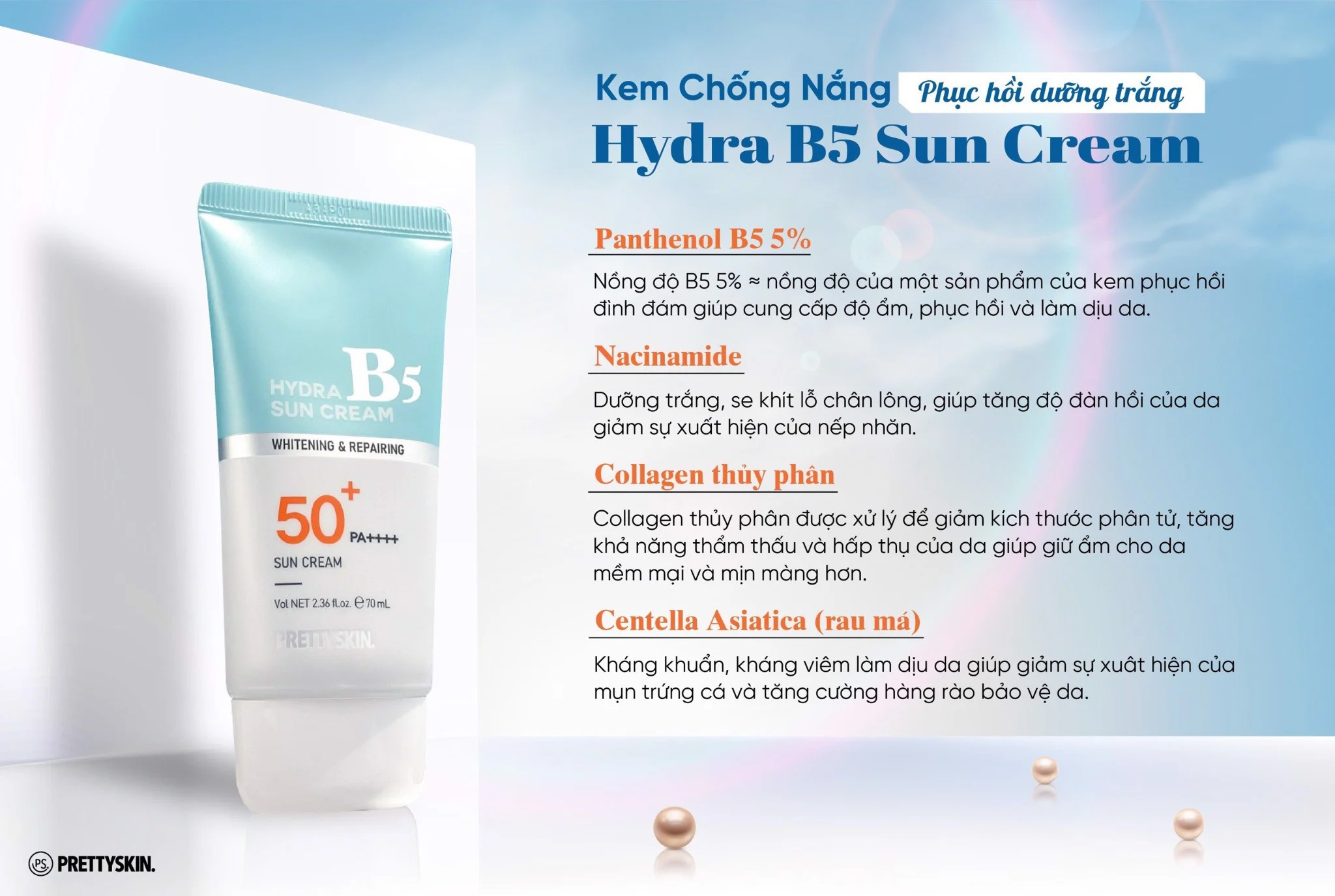 Kem Chống Nắng Pretty Skin Phục Hồi Dưỡng Trắng Hydra B5 Sun Cream SPF 50+/PA+++ là một sản phẩm kem chống nắng với 3 chức năng: chống tia cực tím, làm trắng và cải thiện nếp nhăn, giúp bảo vệ da toàn diện và giúp làn da trở nên trắng sáng hơn sau khi sử dụng.
