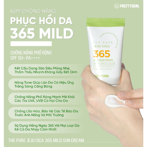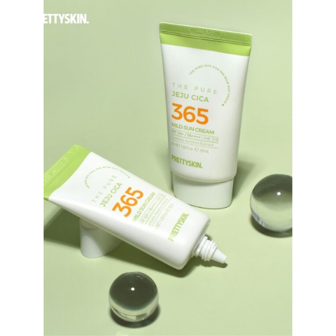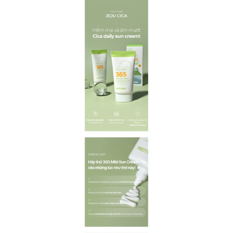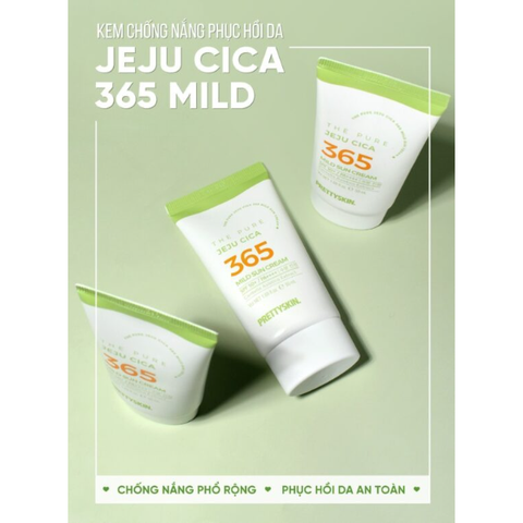 Kem chống nắng rau má The Pure Jeju Cica 365 Mild Sun Cream của PrettySkin là sản phẩm bảo vệ da toàn diện với chỉ số chống nắng cao SPF 50+ PA++++. Được chiết xuất từ các thành phần tự nhiên từ đảo Jeju, sản phẩm không chỉ bảo vệ da khỏi tác hại của tia UV mà còn cung cấp dưỡng chất và làm dịu da.