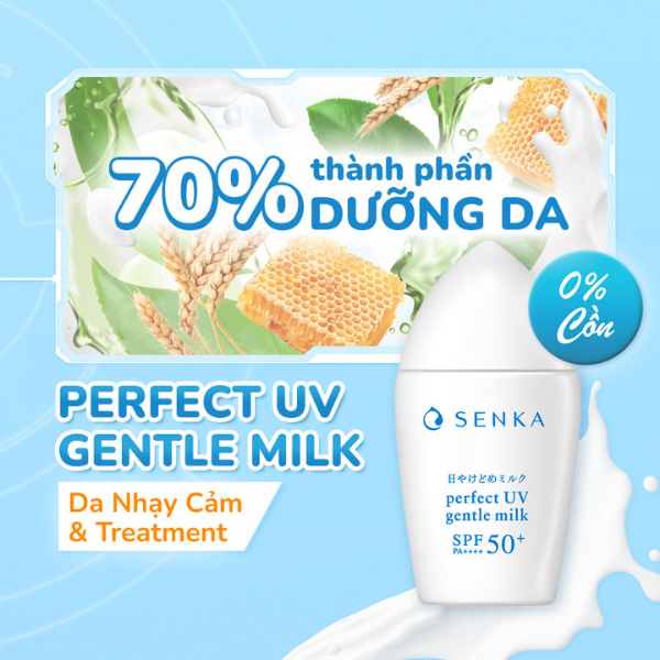 Kem Chống Nắng Vật Lý Dành Cho Da Nhạy Cảm SENKA Perfect UV Gentle Milk SPF 50+ PA++++ được sản xuất bởi thương hiệu Senka nổi tiếng từ Nhật Bản. Với công thức đặc biệt không chứa cồn, dầu khoáng và không gây mụn, sản phẩm mang đến khả năng bảo vệ da toàn diện trước tia UV và các tác nhân gây hại từ môi trường.