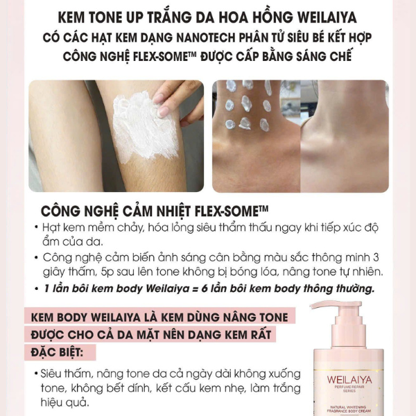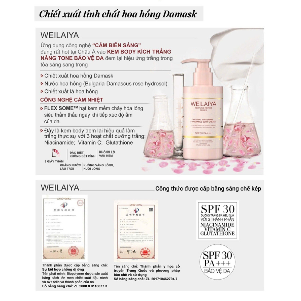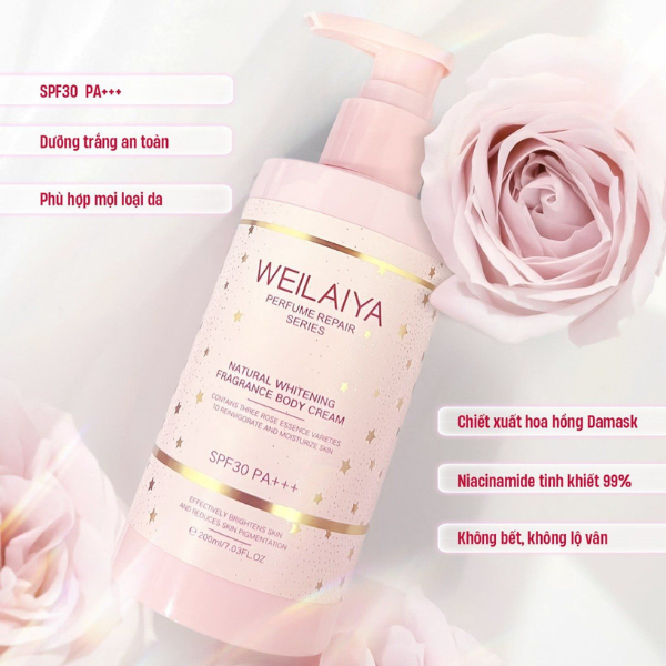 Kem dưỡng trắng da body hoa hồng WEILAIYA Natural Whitening Fragrance Body Cream chứa phức hợp được cấp bằng sáng chế để tăng cường chức năng bảo vệ da. Sản phẩm kem dưỡng trắng da toàn thân Weilaiya là sự kết hợp tinh tế giữa công nghệ tiên tiến và những thành phần tự nhiên quý giá. Bên cạch đó kem dưỡng body Weilaiya được tích hợp chống nắng với chỉ số SPF 30 PA+++