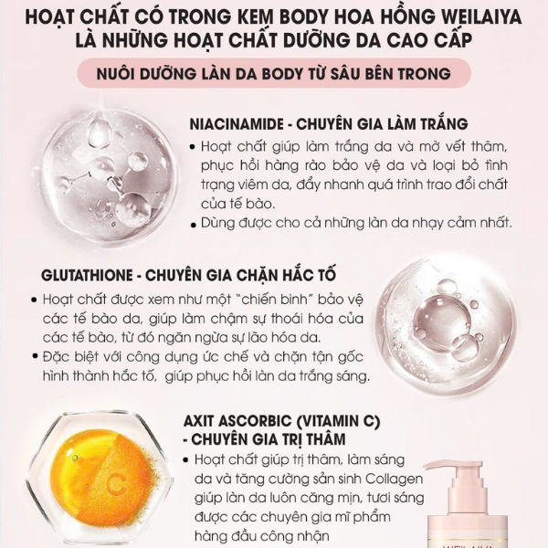 Thành phần chính và công dụng nổi bật Kem dưỡng trắng da body hoa hồng WEILAIYA