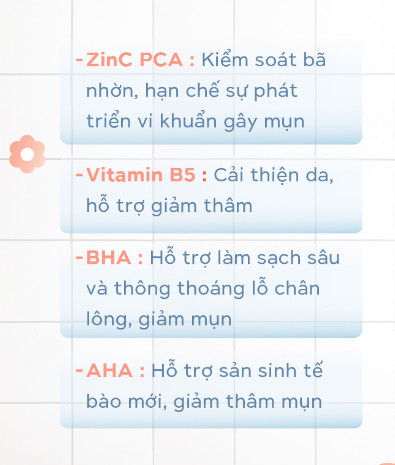 - BHA: Hỗ trợ làm sạch sâu và thông thoáng lỗ chân lông, giảm mụn