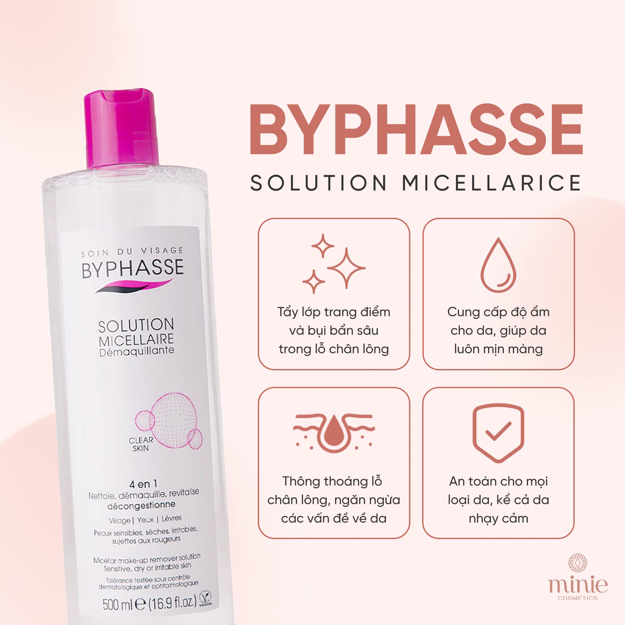 - Nước Tẩy Trang Dành Cho Mọi Loại Da Byphasse Solution Micellaire đặc biệt với các hạt dầu "siêu nhỏ" sẽ lấy đi tất cả bụi bẩn, bã nhờn và lớp trang điểm trên da.