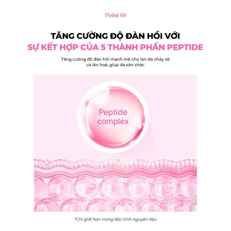 ✦ Phức hợp 5 Peptide và Vitamin Complex 1% giúp kích thích sản sinh collagen, làm đầy rãnh nhăn và tăng độ đàn hồi cho làn da săn chắc hơn.