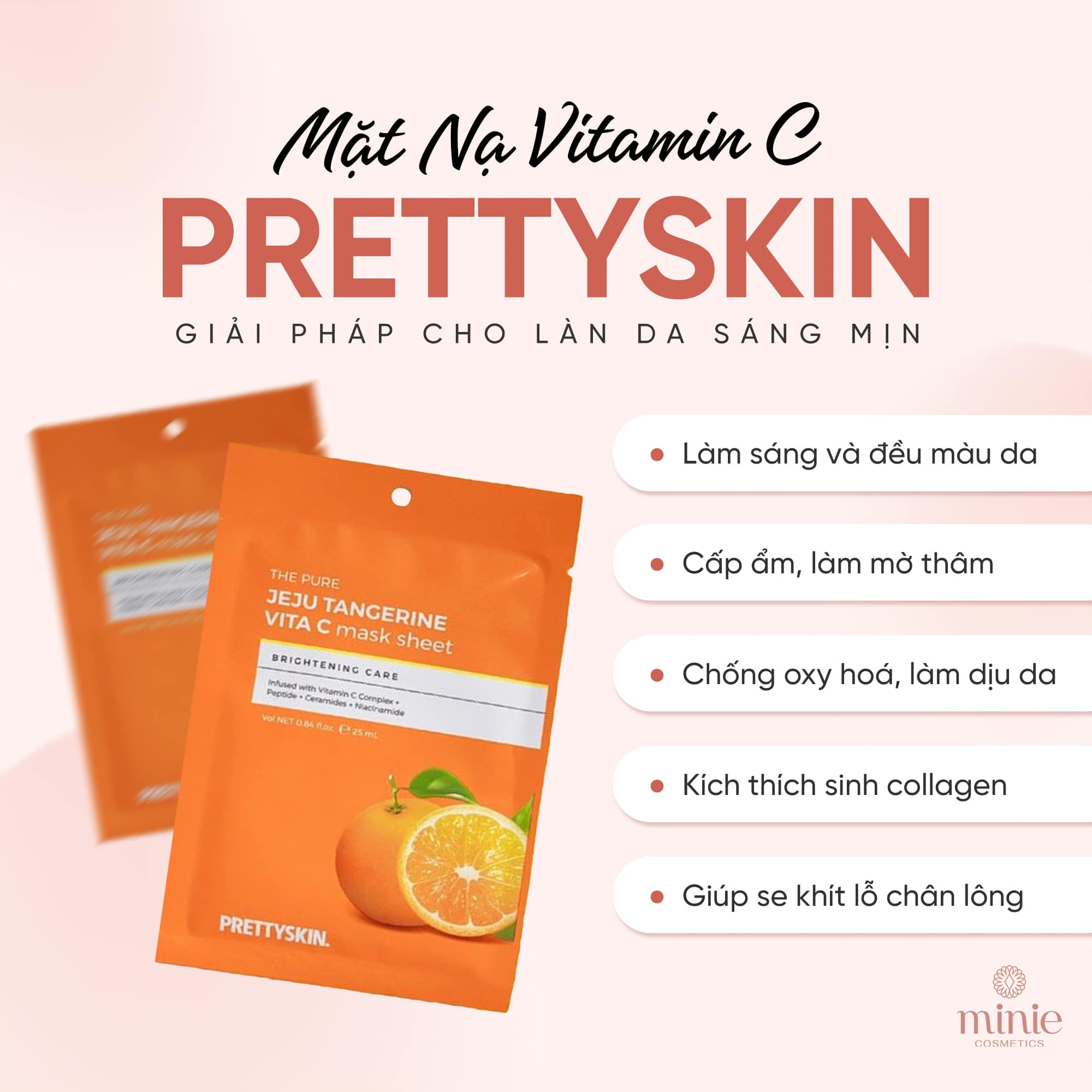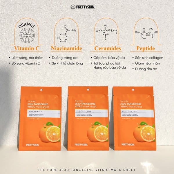 Mặt nạ Vitamin C Pretty Skin The Pure Jeju Tangerine Vita C Mask Sheet là một sản phẩm chăm sóc da đến từ thương hiệu Pretty Skin. Sản phẩm được làm từ các thành phần chiết xuất tự nhiên, trong đó có vitamin C từ quả tangerine (quả quýt) trên đảo Jeju ở Hàn Quốc. Vitamin C là một chất chống oxy hóa mạnh mẽ giúp ngăn ngừa lão hóa và tăng cường sức khỏe cho da. Mặt nạ này giúp cung cấp độ ẩm cho da, làm sáng và làm mềm da, giúp da trông tươi trẻ hơn và rạng rỡ hơn.