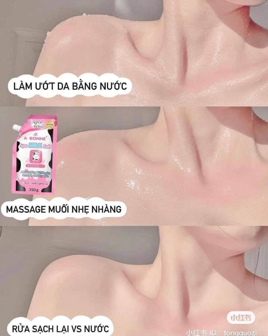 - Cho một ít muối tắm vào lòng bàn tay massage nhẹ nhàng, xoa theo chuyển động tròn trên da ướt.