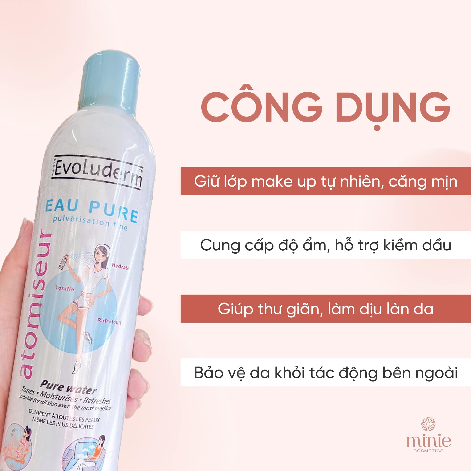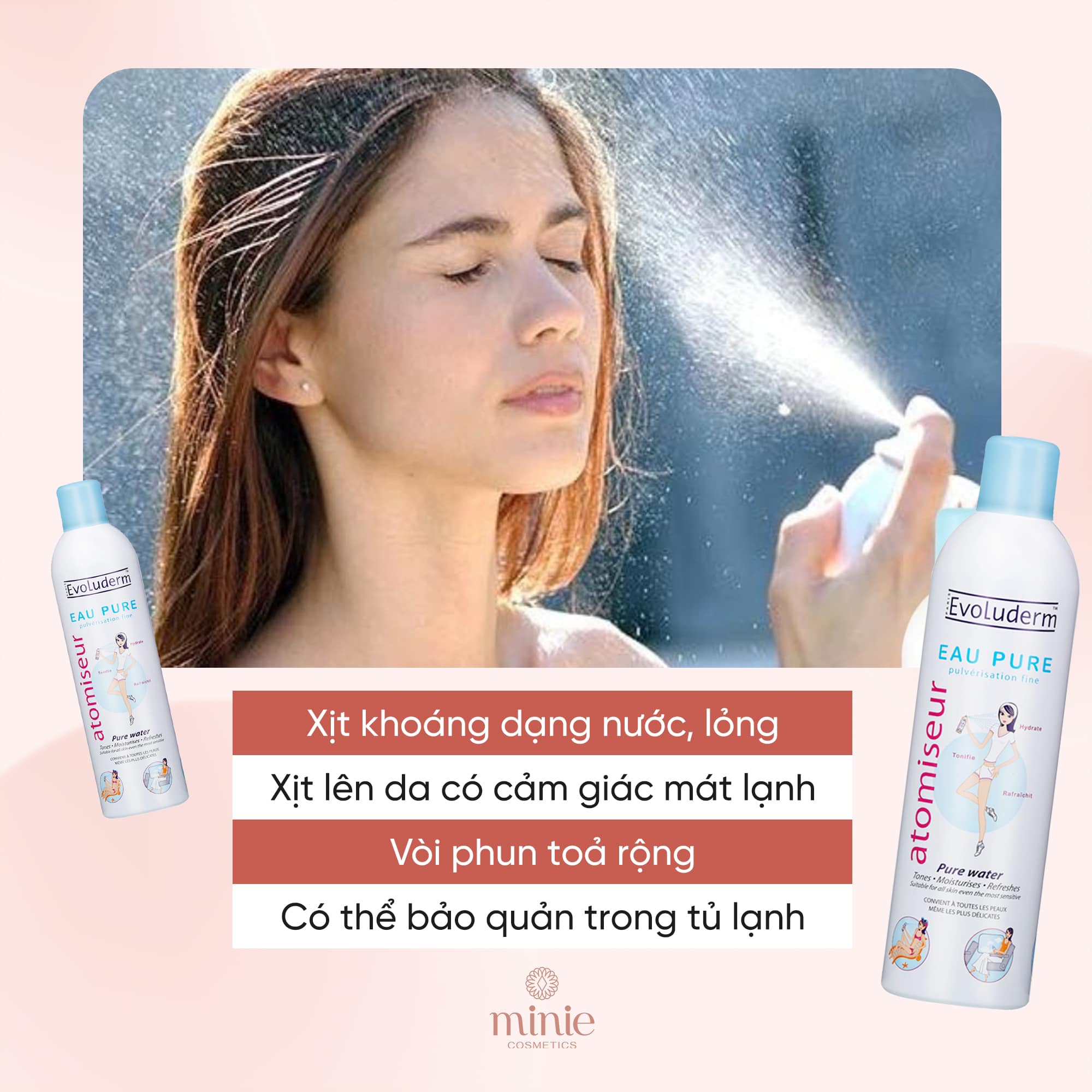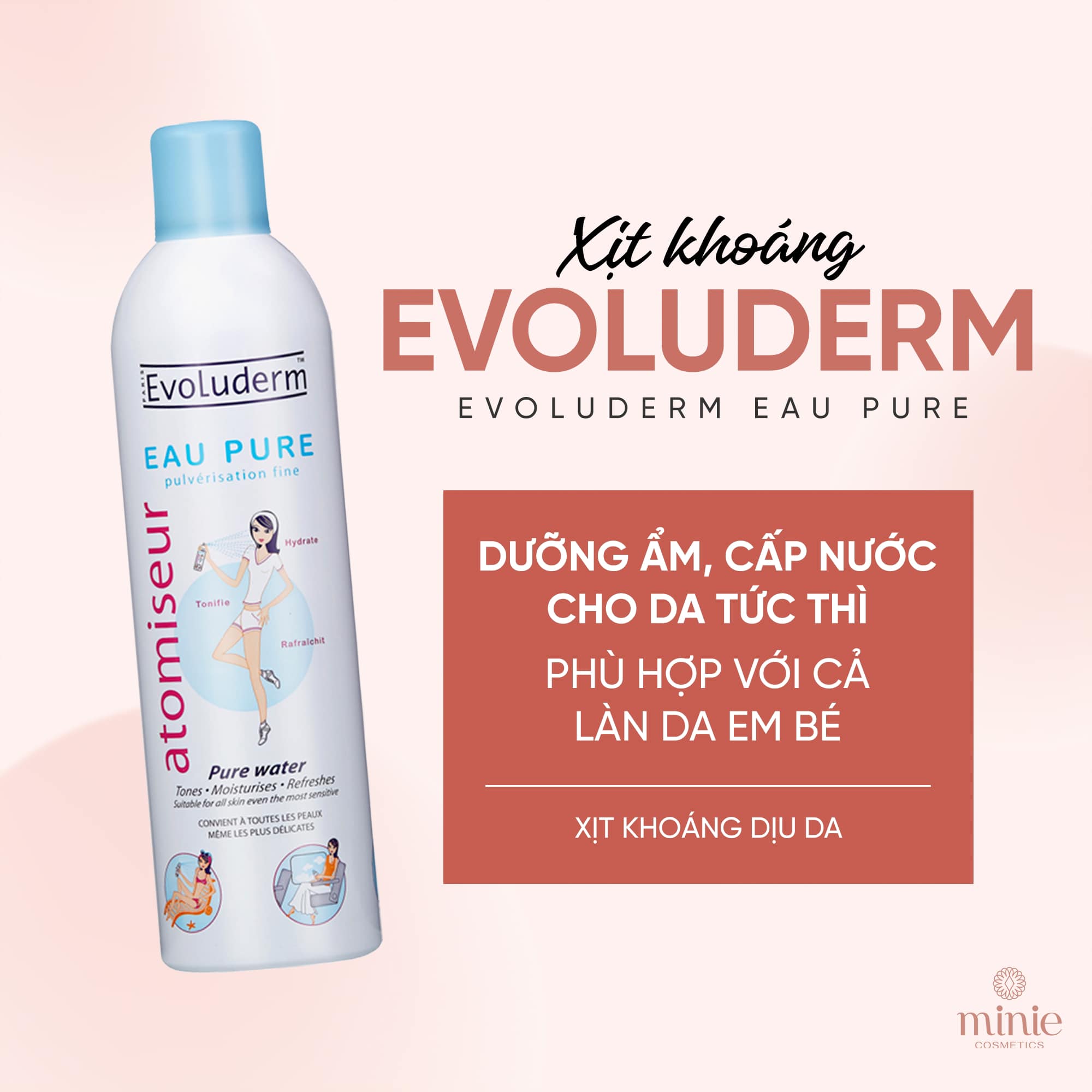- Xịt Khoáng Cấp Nước Evoluderm Atomiseur Eau Pure Water với thành phần chính là nước tinh khiết giàu nguyên tố vi lượng và chất khoáng có đặc tính làm dịu, chống kích ứng, kháng viêm. Ngoài ra chứa thành phần Nitrogen lại có tác dụng nhanh chóng làm dịu những tổn thương của da do nắng gây ra.
