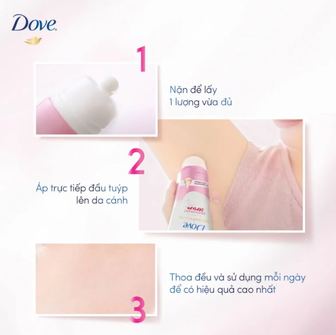 • Hướng dẫn sử dụng: Bóp ống cho đến khi một lượng nhỏ bằng hạt đậu chảy ra khỏi ống, sử dụng trực tiếp đầu ống lên vùng da và thoa đều sản phẩm lên vùng da dưới cánh tay hàng ngày