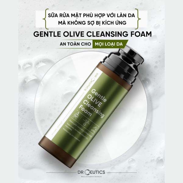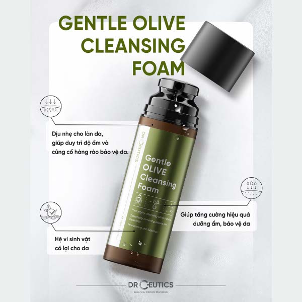 Sữa Rửa Mặt Dịu Nhẹ DR.CEUTICS Gentle Olive Cleansing Foam 150ml tạo bọt nhẹ nhàng, giúp làm sạch sâu mà không gây khô da. Sản phẩm này được thiết kế để loại bỏ bụi bẩn và bã nhờn, đồng thời duy trì sự cân bằng tự nhiên của da.