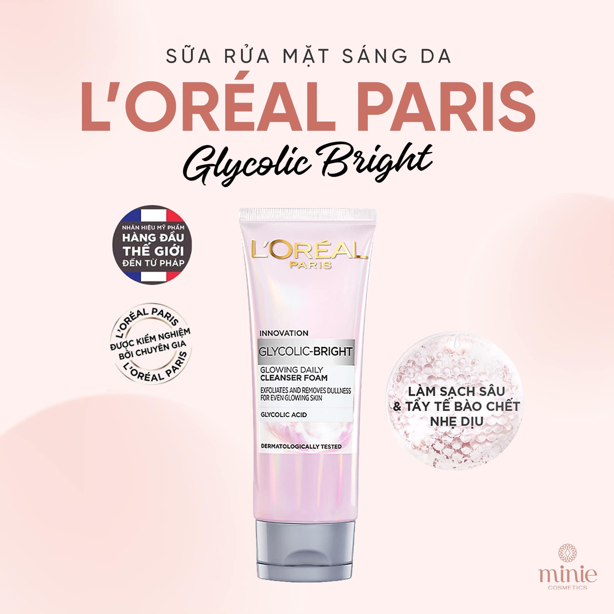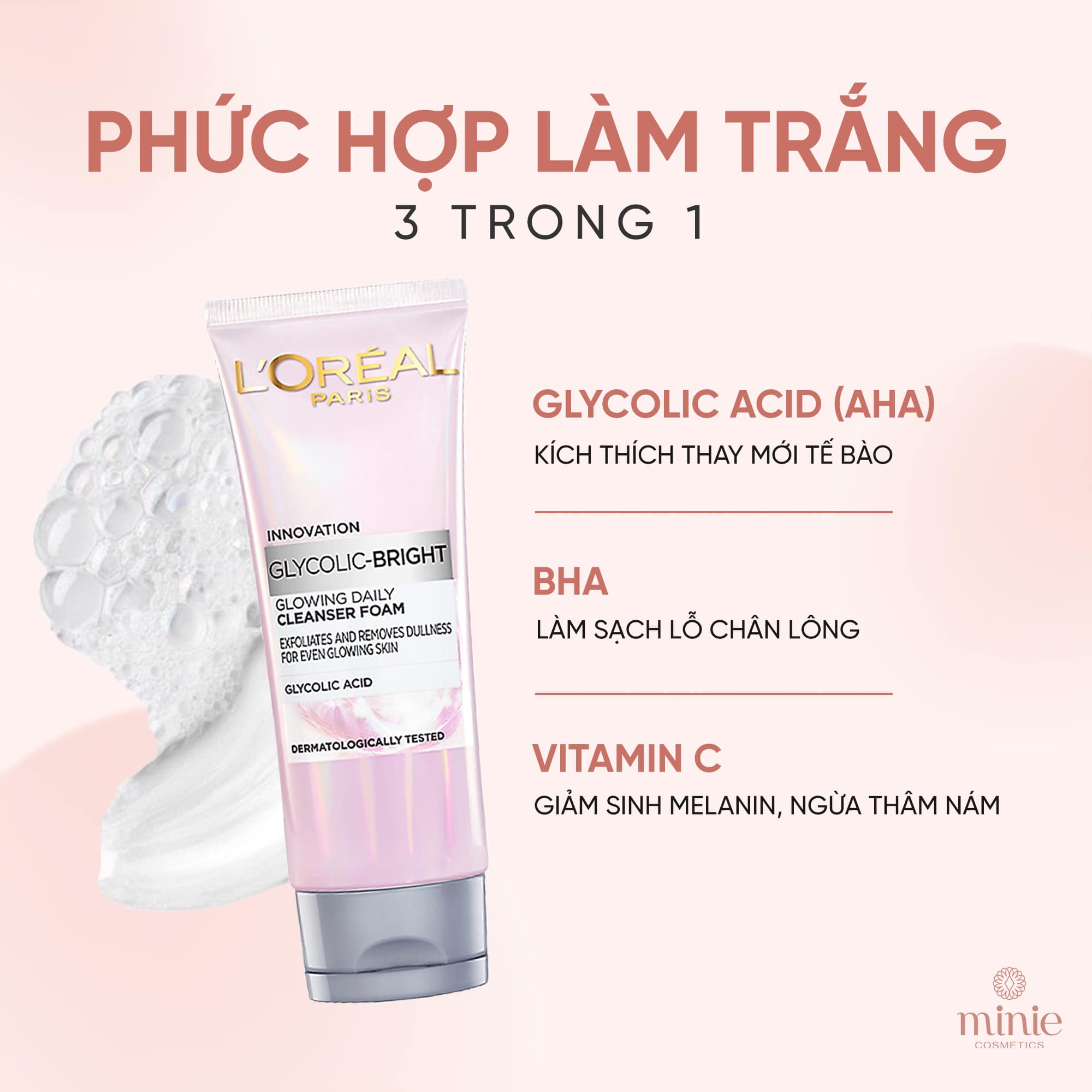- Sữa Rửa Mặt Sáng Da L'oreal Glycolic-Bright Glowing Daily Cleanser Foam có thành phần Glycolic Acid (AHA) giúp loại bỏ tế bào chết hiệu quả, làm sáng da tức thì, làm sạch lỗ chân lông mang đến cho bạn một làn da mềm mịn. Đồng thời, Glycolic Acid có trọng lượng phân tử nhỏ nhất trong nhóm AHA, giúp thẩm thấu sâu hơn và làm sạch tế bào da chết nhẹ nhàng trên bề mặt da giúp hỗ trợ quá trình tái tạo da, cho làn da trông tươi sáng, rạng rỡ hơn.