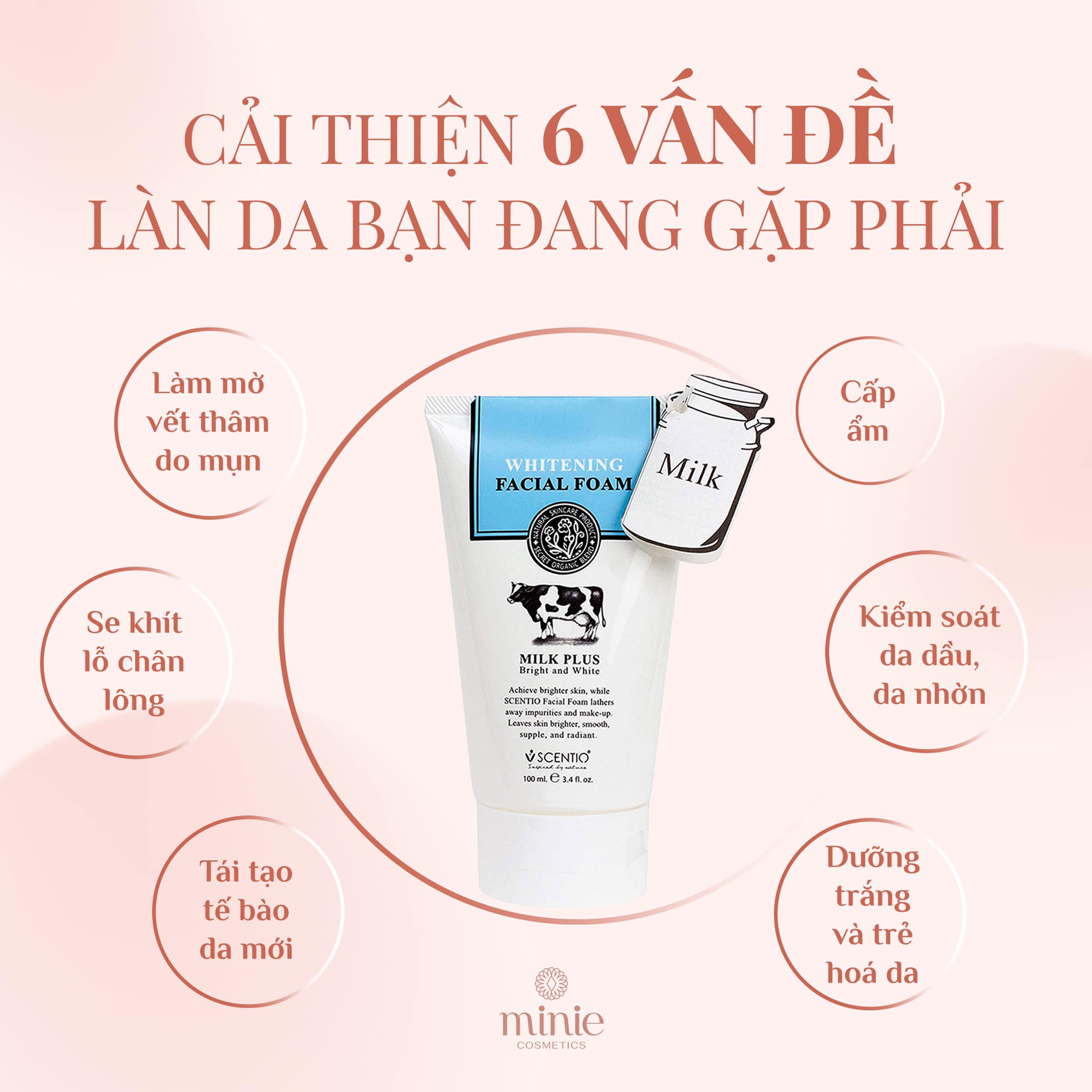 Là sữa rửa mặt được ưa chuộng nhất tại Thái Lan, sữa rửa mặt Scentio Milk Plus (hay thường gọi là sữa rửa mặt bò Thái Lan của Beauty Buffet) có ưu điểm vượt trội trong việc làm sạch mọi bụi bẩn, bã nhờn, bảo vệ da, ngăn ngừa mụn. Sữa rửa mặt giàu dưỡng chất nuôi dưỡng da mặt mềm mại, mịn màng và trắng sáng từng ngày, trẻ hóa da, ngăn ngừa lão hóa. Da được cấp ẩm tự nhiên và cân bằng. Bảo vệ làn da khỏi những tác nhân gây hại. Hương thơm sữa bò đặc trưng lôi cuốn, dễ chịu.