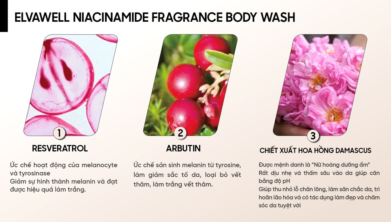 Thành phần và công dụng nổi bật Sữa Tắm Nước Hoa Trắng Da Niacinamide Elvawell