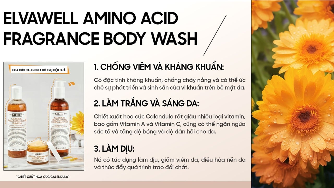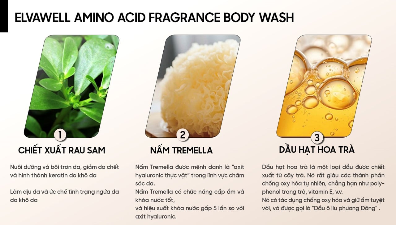 Thành phần và công dụng nổi bật Sữa tắm nước hoa nuôi dưỡng cấp ẩm Amino Acid Elvawell