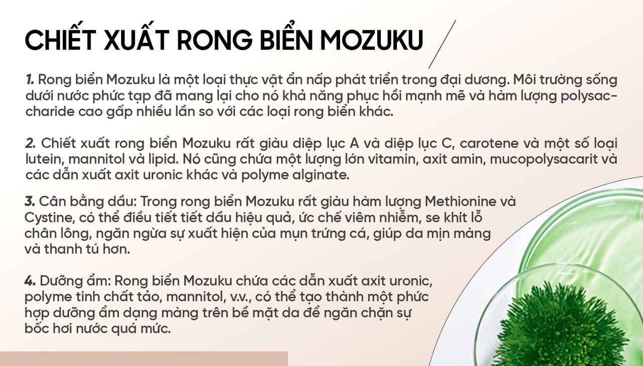 - Chiết Xuất Rong Biển Mozuku: Giàu diệp lục A và C, carotene, lutein, vitamin, axit amin, mucopolysacarit và các dẫn xuất axit uronic. Rong biển Mozuku có khả năng cân bằng dầu, dưỡng ẩm và se khít lỗ chân lông, giúp da mịn màng và thanh tú hơn.
