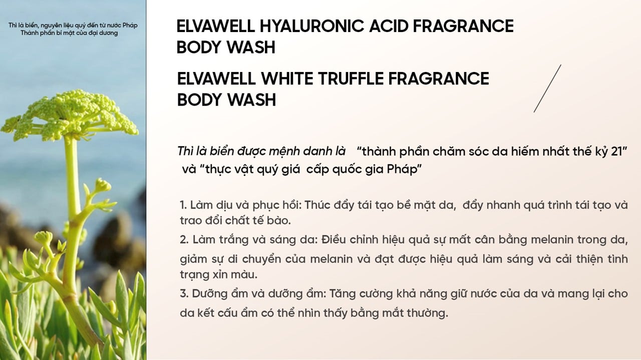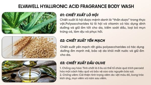 Thành phần và công dụng nổi bật Sữa tắm nước hoa cấp ẩm Elvawell Hyaluronic Acid Elvawell