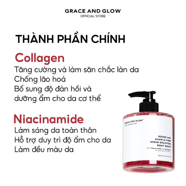 3. Sữa tắm tẩy da chết Grace and Glow Rouge 540 Glow & Firm Scrub Solution Body Wash Niacinamide + Collagen Grace & Glow Body Wash