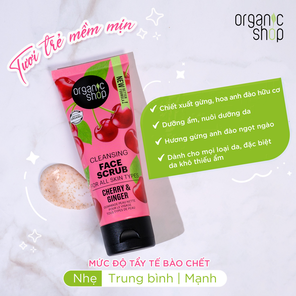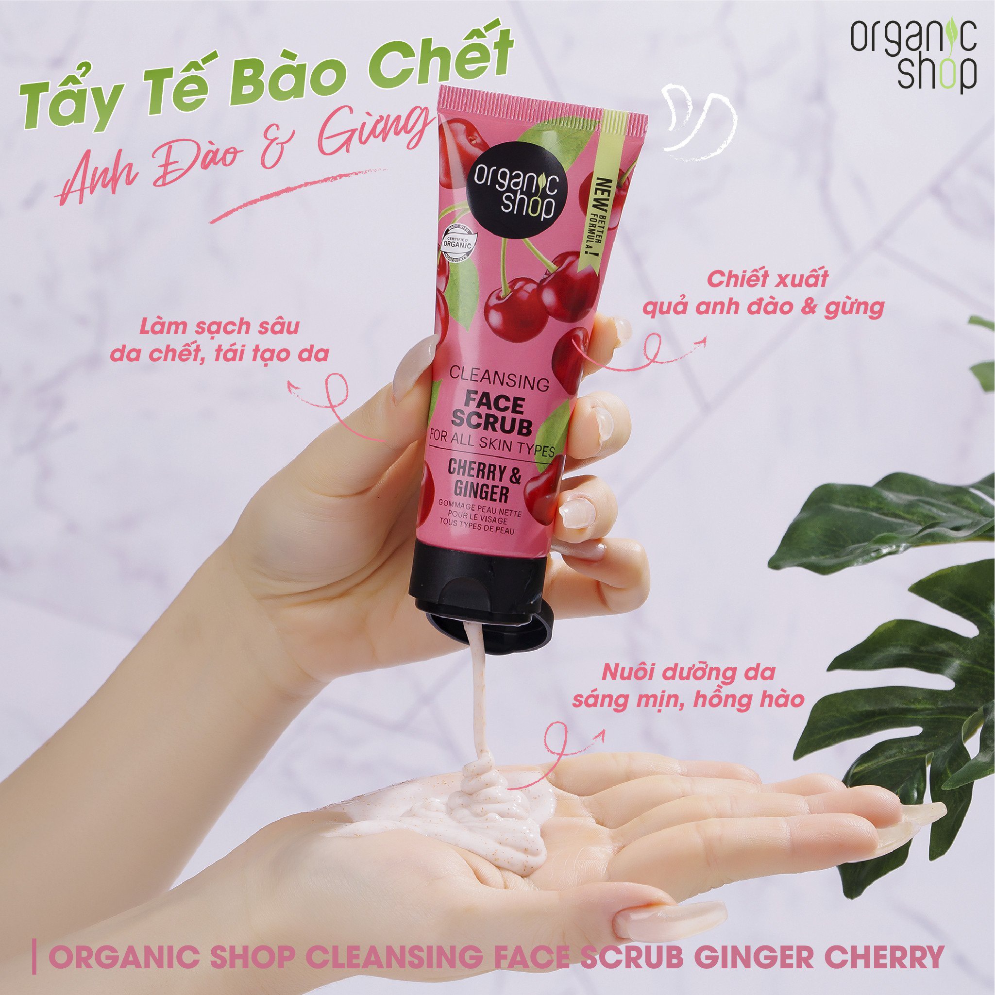 Tẩy Da Chết Cho Mặt Organic Shop Gừng & Cherry Face Scrub Ginger & Cherry 75ml là sản phẩm tẩy tế bào chết da mặt đến từ thương hiệu mỹ phẩm Organic Shop của Cộng Hòa Estonia,, với kết cấu mềm mượt giúp nhẹ nhàng loại bỏ tế bào chết tích tụ trên bề mặt da, mang lại làn da mịn màng và tươi sáng hơn. Đặc biệt, chiết xuất từ gừng và quả cherry cùng kết cấu chứa hạt scrub giúp loại bỏ các tế bào chết xỉn màu, dưỡng da ẩm mượt, đều màu, sáng mịn.