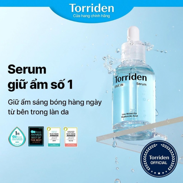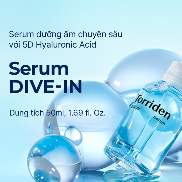 Tinh Chất Dưỡng Ẩm Hỗ Trợ Phục Hồi Da Torriden Dive In Low Molecular Hyaluronic Acid Serum 50ml Với công nghệ axit hyaluronic phân tử thấp 5D, giúp thẩm thấu sâu vào da dễ dàng, giữ nước và cải thiện độ đàn hồi, mang lại làn da mềm mại và mịn màng hơn.