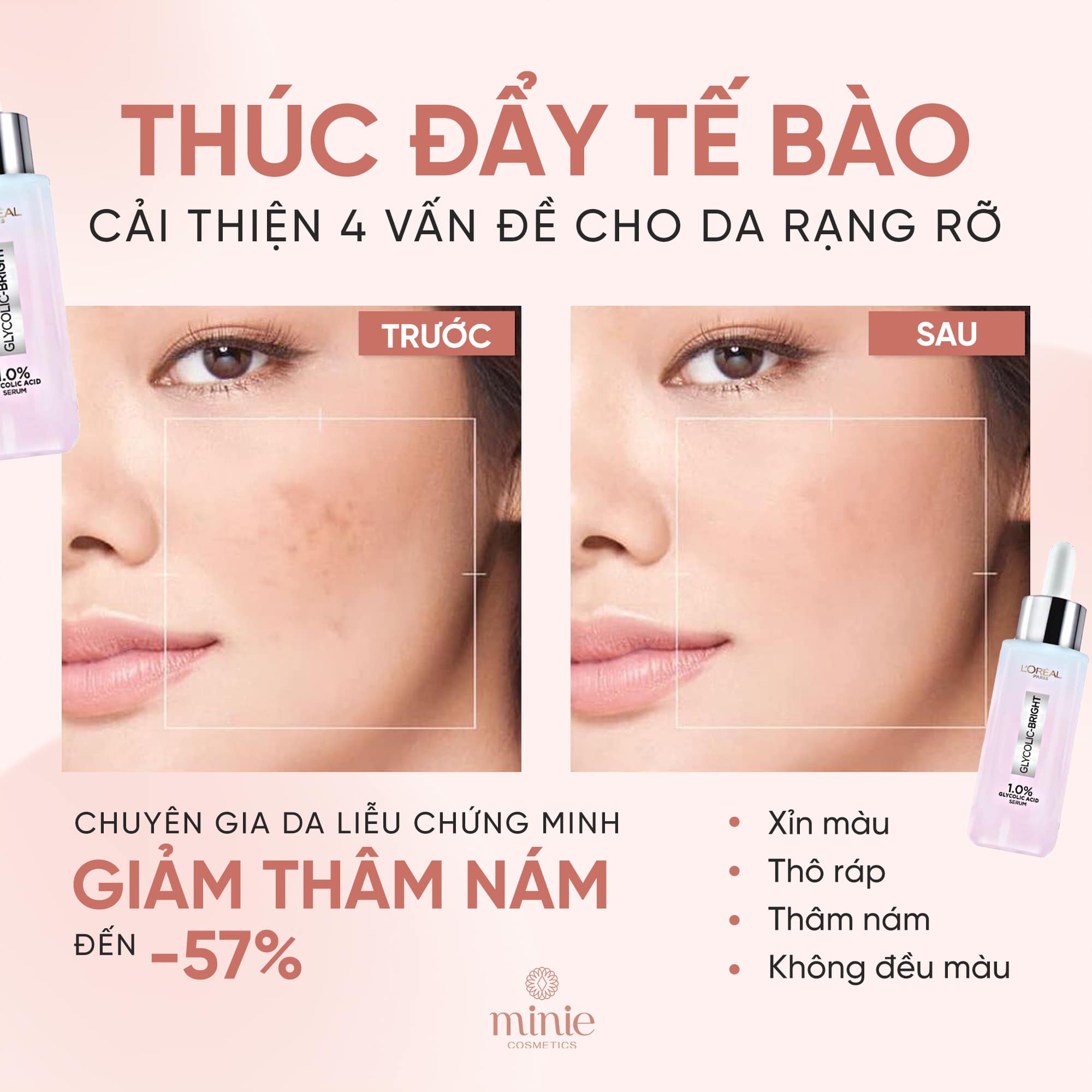 - Serum L'oreal Tinh Chất Mờ Thâm Nám Sau 2 Tuần L'oreal Glycolic-Bright Instant Glowing Serum đem đến hiệu quả vượt trội giúp dưỡng da trắng rạng rỡ, mịn màng